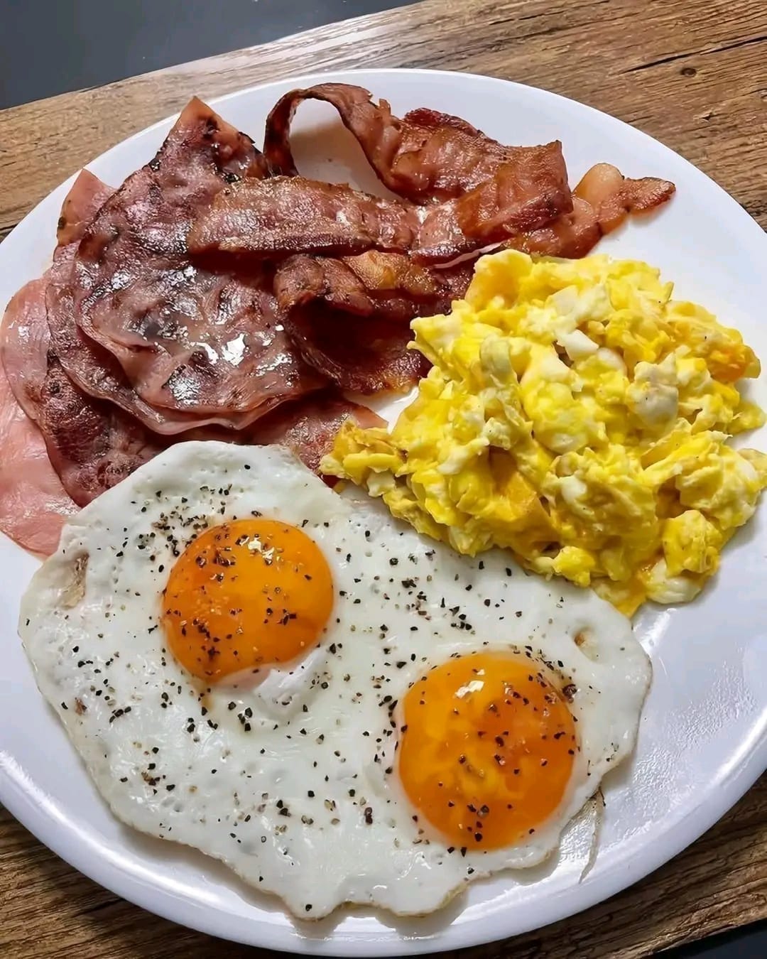 Simple Classic Breakfast Trio (Bacon or Ham, Creamy Scrambled Eggs, and Sunny-Side-Up Eggs)