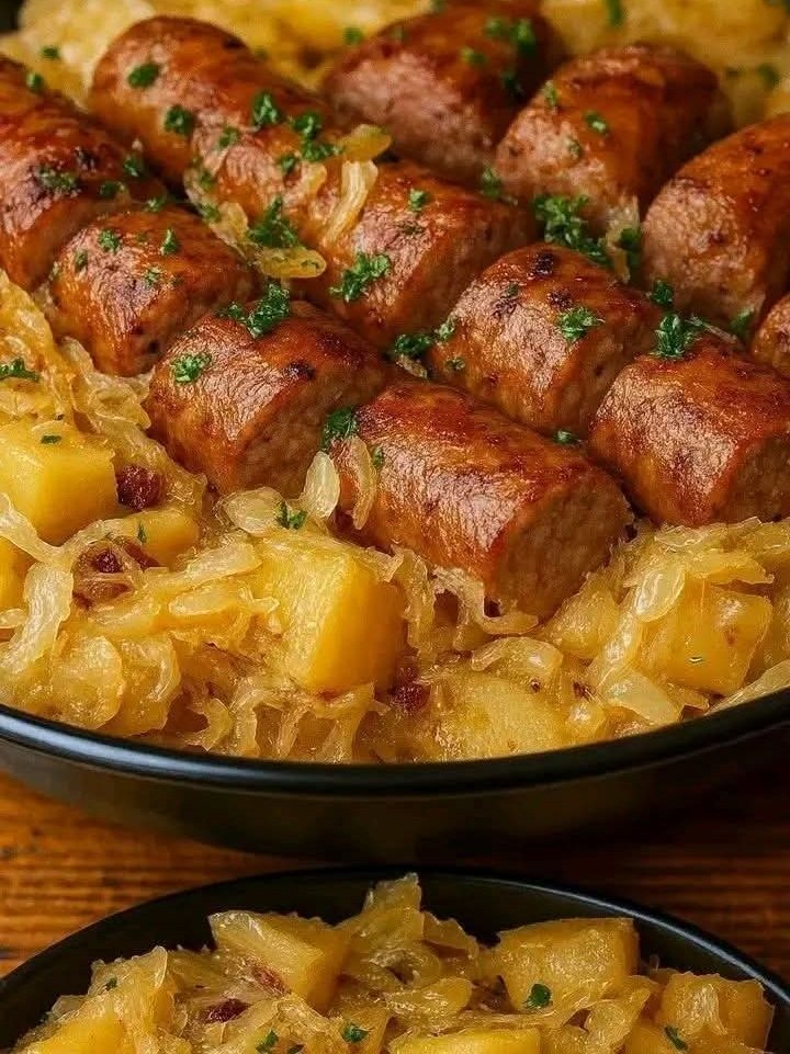 This hearty skillet sausage with potatoes and sauerkraut is a simple one-pan dinner bursting with smoky flavor and comforting textures. Tender potatoes, tangy sauerkraut, and golden sausages come together in a rich, savory broth for a rustic dish that’s perfect for busy evenings. It’s satisfying, budget-friendly, and ready with minimal effort.